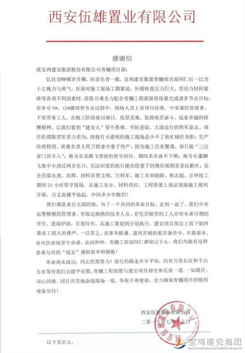 2019717日,我公司路橋項(xiàng)目部承建的中南青樾項(xiàng)目收到由建設(shè)單位西安伍雄置業(yè)有限公司發(fā)出的一封感謝信,信中言辭懇切,對(duì)路橋公司青樾項(xiàng)目管理人員給出了極高的評(píng)價(jià)。在面對(duì)施工現(xiàn)場(chǎng)工期緊迫、資金短缺、外圍檢查壓力巨大、勞動(dòng)力材料緊缺等各項(xiàng)不利因素時(shí),寶雞建安集團(tuán)青樾項(xiàng)目部各位同仁克服自身困難、艱苦奮斗、不畏艱難以一當(dāng)十之魄力與勇氣保質(zhì)保量并按工期節(jié)點(diǎn)完成了施工任務(wù)。