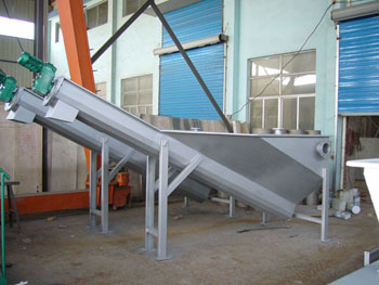 砂水混合物從頂部的法蘭接管進入儲液箱內。箱內專門設計的散水盤使水匯集于下水槽。砂水混合夜中,砂石逐漸沉淀于下部的螺旋u形槽內?招膸铰菪徛D砂礫推向上出口,自然脫水排除。